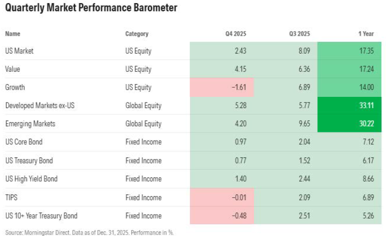 We have used two words frequently this year to describe the markets, consistent and resilient. We can use them again to describe the 4th quarter, since positive momentum for the markets which started early in 2025 was maintained through the end of the year. When you describe a market as consistent, the usual assumption might be that not much occurred in the world to move markets. That was not the case this quarter or this year, however the market maintained the same resiliency to headline risk it has exhibited all year. During the 4th quarter, the market endured the longest U.S. government shutdown in history, rising investor concerns over the durability of tech stock valuations, and wavering job data to only name a few headlines.
